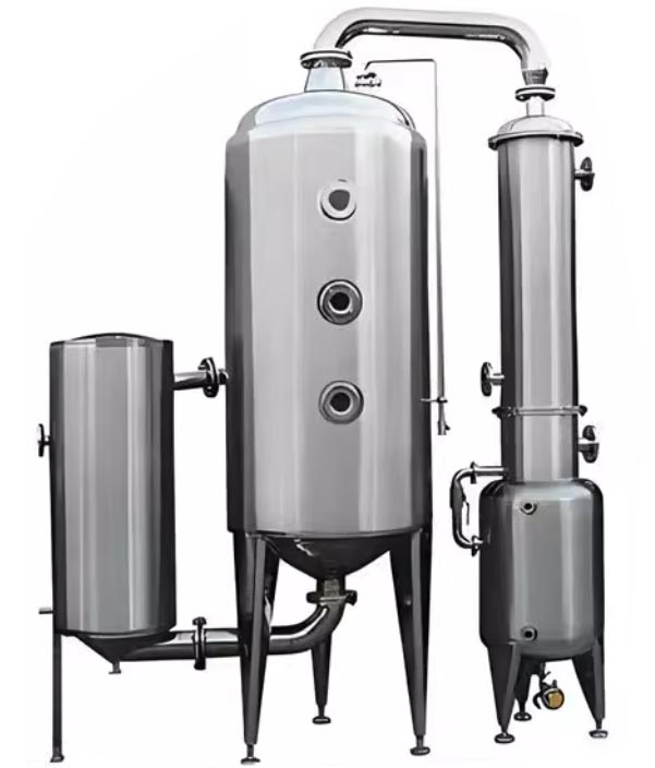 单效外循环真空浓缩器,由加热器、蒸发器、除沫器、冷凝器、冷却器、受液罐等组成,凡与物料接触部件均采用优质不锈钢制作,本设备